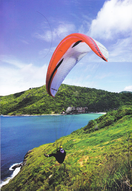 หลังจาก 3 ชั่วโมงผ่านพ้น การรอคอยก็ไม่สูญเปล่า เมื่อลมลดแรงกระโชก คุณกิ๊กออกไปบินทดสอบสภาพอากาศและแรงลมเป็นคนแรกของไซต์บินนี้ ตามที่เรียกกันว่า Wind Dummy ก่อนกลับมาบอกว่าพร้อมพาเราบินไปพบมุมมองใหม่ ณ ปลายเกาะภูเก็ตแล้ว จาก ร่มร่อน หรือ พาราไกลดิง (Paragliding) ที่ลอยลมเพียงลำพัง ในเวลาไม่ถึงชั่วโมงร่มร่อนอีกตัวที่นักบินรีบบึ่งมอเตอร์ไซค์ขึ้นเขามาบิน ก็ทะยานรับลมออกไปละล่องร่วมฟ้า เป็นบรรยากาศของการเดินทางและการพักผ่อนแสนรื่นรมย์