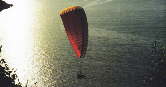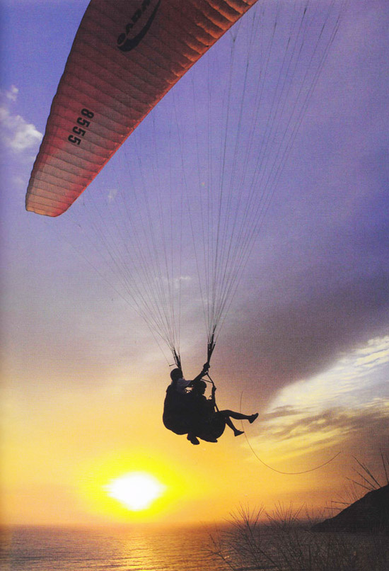 ทว่าในเวลานี้สำหรับผู้ที่อยากจะบินนั้น แทบไม่ต้องนึกถึงความอยากจะลงเลย เพราะแสงอุ่นละมุนยามใกล้เย็นทาบทาผืนทะเลเป็นประกายระยิบ ผนวกกับกระแสลมที่ยังคงพัดต่อเนื่องพอเหมาะ สังเกตได้จากถุงลม (Wind Sock) ข้างกังหันใหญ่ที่ขณะนี้รับลมจนพองฟูพรูพลิ้วตั้งฉากกับแนวหน้าผา บ่งบอกให้รู้ว่านี้คือเวลาของพาราไกลดิงอย่างแท้จริง